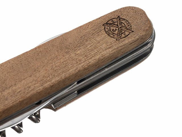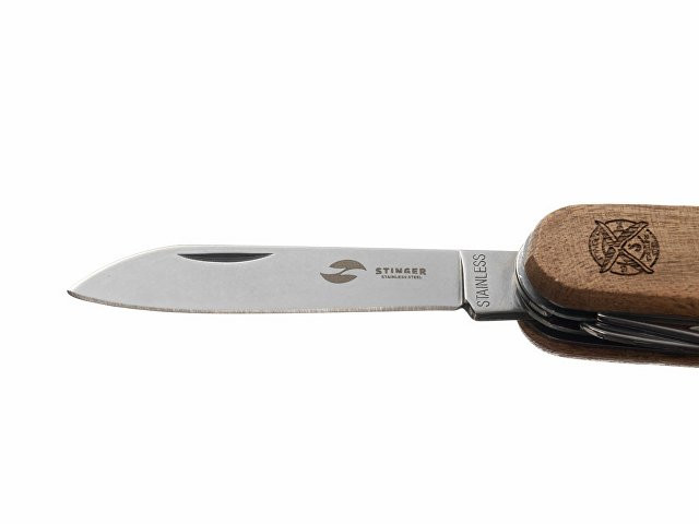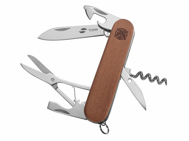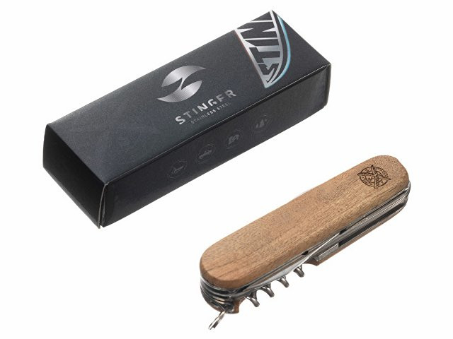 Нож перочинный STINGER имеет 11 функций: 1. Большое лезвие 2. Консервный нож с: 3. – Малой отвёрткой 4. Шило с: 5. – Иглой 6. Открывалка для бутылок с: 7. – Отвёрткой 8. – Инструментом для снятия изоляции 9. Ножницы 10. Штопор 11. Кольцо для ключей ХАРАКТЕРИСТИКИ Материалы: • лезвие/инструменты: нержавеющая сталь AISI 420, твердость 44-48 HRC • рукоять: нержавеющая сталь AISI 420, твердость 44-48 HRC • накладки рукояти: древесина сапеле (энтандрофрагма цилиндрическая) Размер: 90 мм Вес: 69 г Цвет накладок рукояти: коричневый Накладки рукояти ножа не подлежат замене. Упаковка: картонная коробка