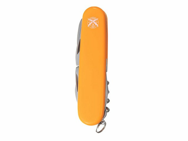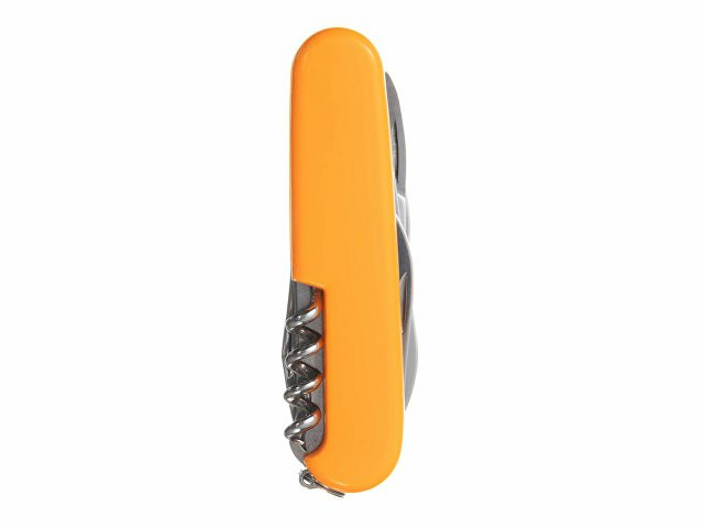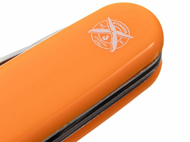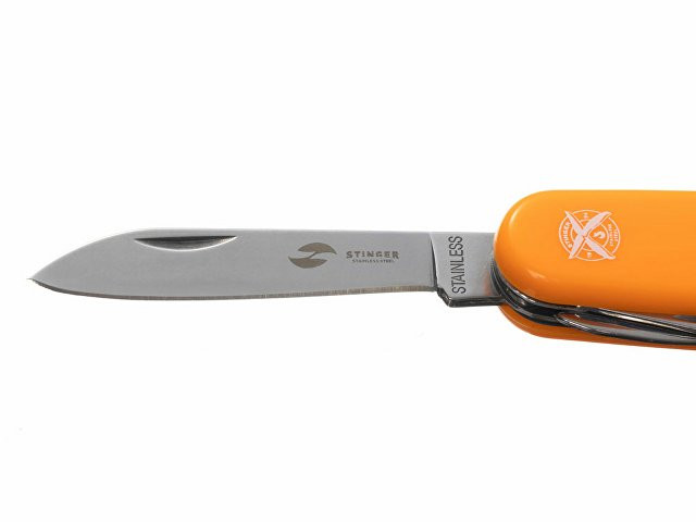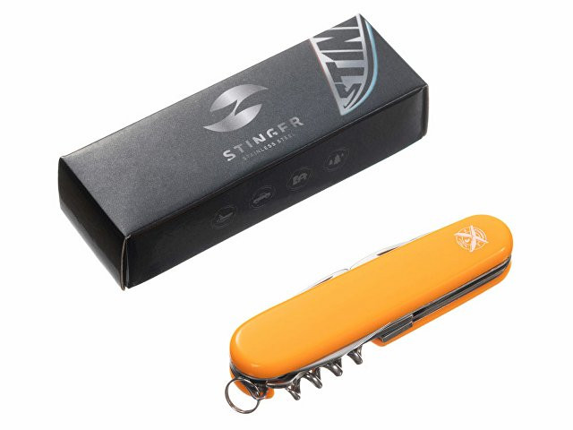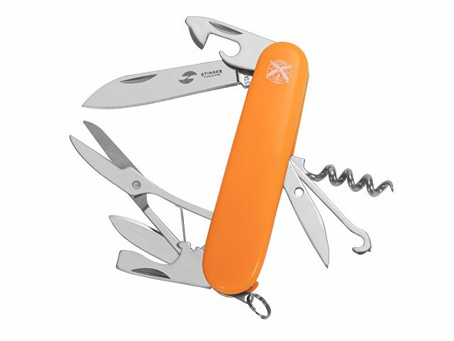 Нож перочинный STINGER имеет 13 функций: 1. Большое лезвие 2. Консервный нож с: 3. – Малой отвёрткой 4. Малое лезвие 5. Открывалка для бутылок с: 6. – Отвёрткой 7. – Инструментом для снятия изоляции 8. Ножницы 9. Многофункциональный крючок 10. Штопор 11. Шило с: 12. – Иглой 13. Кольцо для ключей ХАРАКТЕРИСТИКИ Материалы: • лезвие/инструменты: нержавеющая сталь AISI 420, твердость 44-48 HRC • рукоять: нержавеющая сталь AISI 420, твердость 44-48 HRC • накладки рукояти: АБС-пластик Размер: 90 мм Вес: 114 г Цвет накладок рукояти: оранжевый Накладки рукояти ножа не подлежат замене. Упаковка: картонная коробка