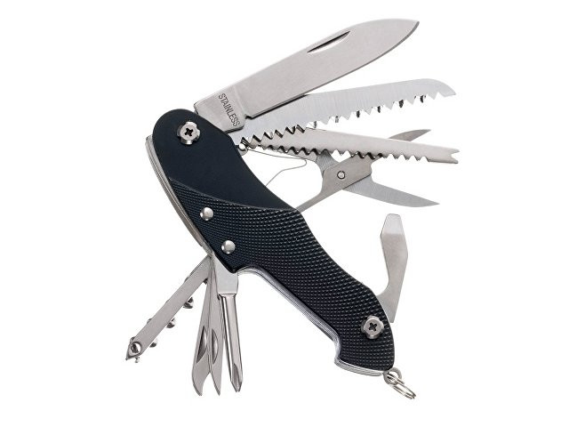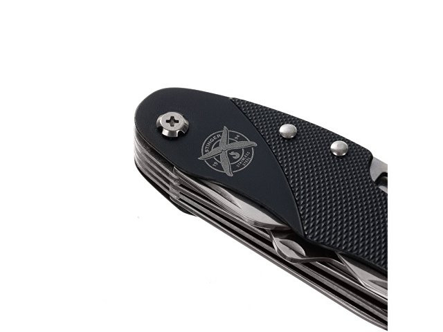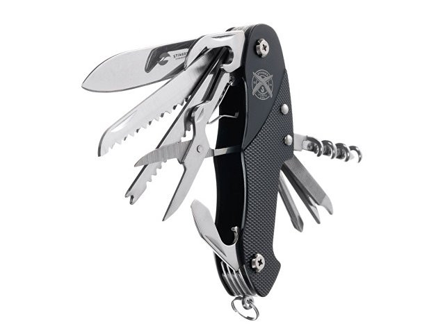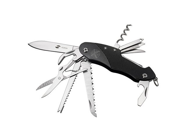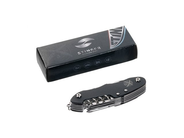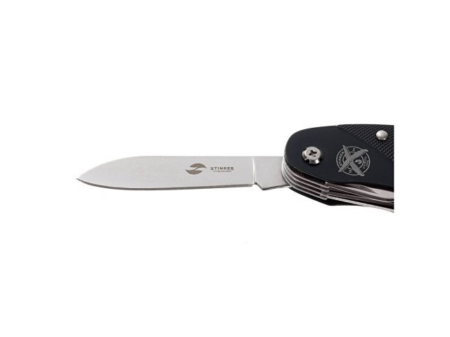 Нож перочинный STINGER имеет 15 функций: 1. Большое лезвие 2. Пила по дереву 3. Инструмент для чистки рыбы с: 4. - Инструментом для извлечения рыболовного крючка 5. Ножницы 6. Консервный нож 7. Открывалка для бутылок с: 8. - Отверткой 9. Крестовая отвертка 10. Ледокол 11. Пилка для ногтей с: 12. - Инструментом по уходу за ногтями 13. Игла 14. Штопор 15. Кольцо для ключей Материалы • лезвие/инструменты: нержавеющая сталь 420, твердость 44-48 HRC • рукоять: нержавеющая сталь 420, твердость 44-48 HRC • накладки рукояти: алюминий Размеры • Размеры ножа: 96х28х19 мм • Общая длина: 158,8 мм • Длина клинка: 62,5 мм • Наибольшая ширина клинка: 12 мм • Толщина обуха: 1,7 мм • Длина рукояти: 96,3 мм • Ширина рукояти (в ср.части): 24,5 мм • Толщина рукояти (в ср.части): 15 мм Вес: 105 г Цвет накладок рукояти: черный Накладки рукояти ножа не подлежат замене. Упаковка: картонная коробка