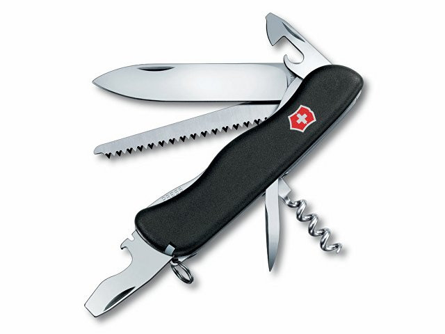 Перочинный нож FORESTER имеет 12 функций: 1. Фиксирующееся лезвие 2. Штопор 3. Консервный нож с: 4. – Малой отвёрткой 5. Фиксирующаяся открывалка для бутылок с: 6. – Отвёрткой 7. – Инструментом для снятия изоляции 8. Шило, кернер 9. Кольцо для ключей 10. Пила по дереву 11. Пинцет 12. Зубочистка