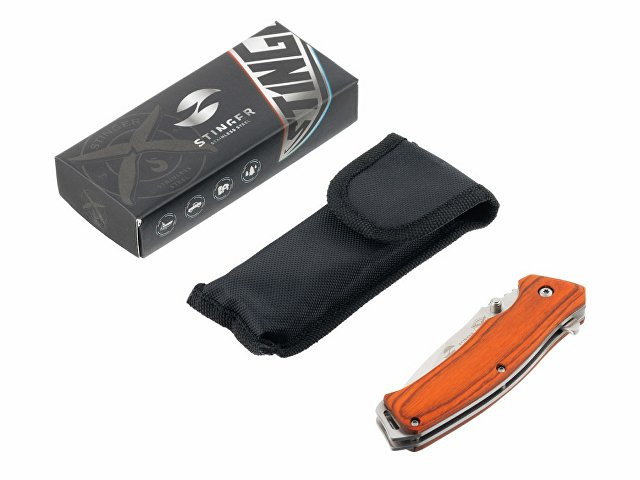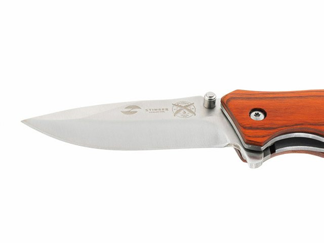 НОЖ СКЛАДНОЙ STINGER Материал лезвия: нержавеющая сталь Материал рукояти: сталь + дерево Фиксатор лезвия: Liner Lock Длина ножа: 190 мм Длина клинка: 80 мм Толщина клинка: 3 мм Вес: 132 г Цвет рукояти: коричневый Особенности: рукоять с отверстием под темляк Метод открывания клинка: шпенёк (подпальцевый упор на лезвии) В комплекте: нейлоновый чехол