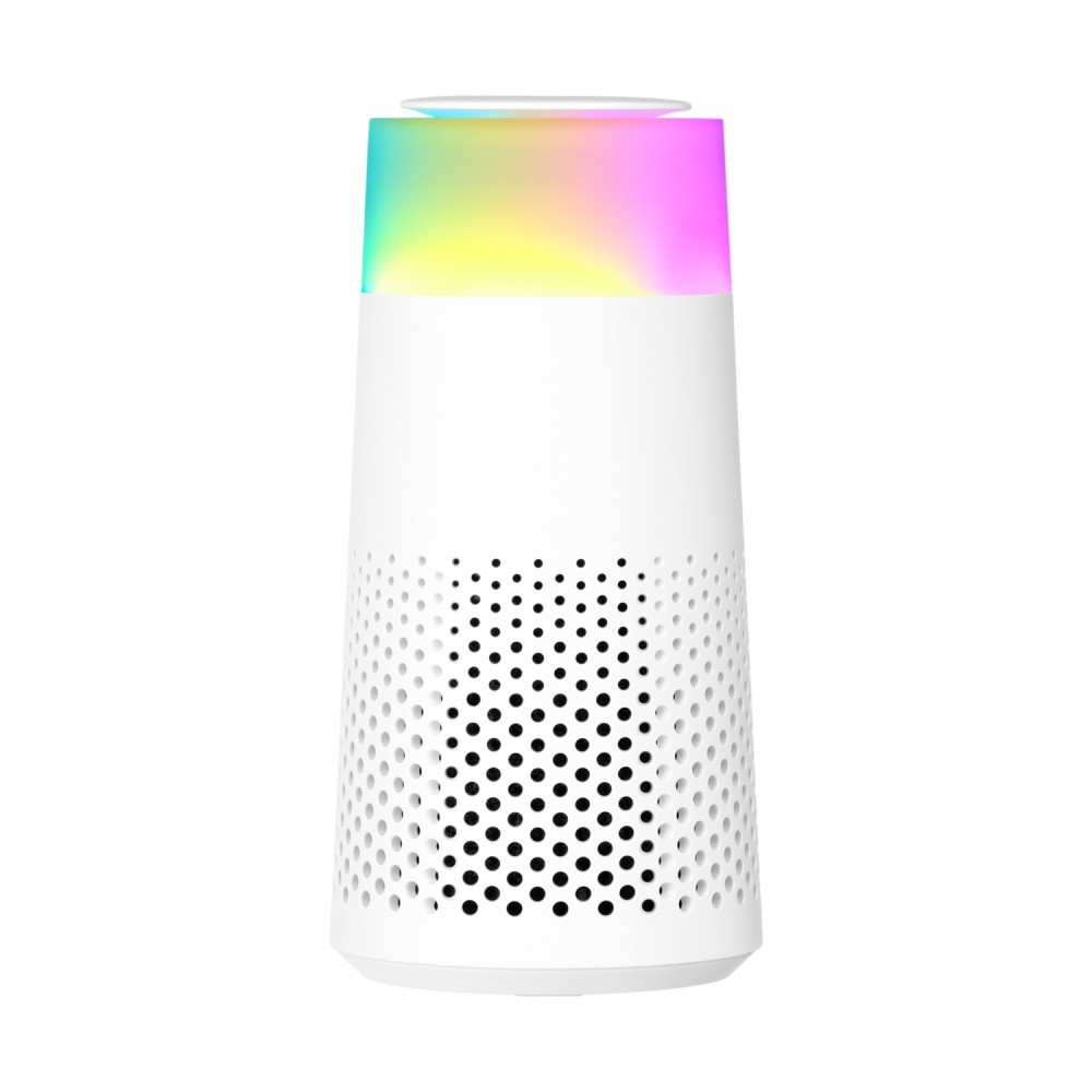 Мини-очиститель воздуха с радужной LED-подсветкой. Высококачественный фильтр с тройной системой фильтрации в сочетании с высокоскоростным вентилятором очищают воздух, поглощая и фильтруя различные загрязнители через гладкую аэродинамическую трубу. Освежение воздуха за несколько минут.