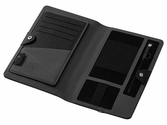 Органайзер Manner от Voyager поддерживает функции проводной и беспроводной зарядки. Беспроводная зарядка возможна с устройствами, поддерживающими стандарт Qi. Органайзер закрывается на кнопку, имеет фиксирующие резинки для проводов и других мелочей, а также большой карман, отсек для паспорта и 4 — для карточек. Для проводной зарядки предусмотрен встроенный провод. - встроенный аккумулятор 5000 мАч с беспроводной зарядкой - универсальный кабель 3-в-1 - отсеки для наиболее необходимых предметов позволяют рассортировать содержимое - высококачественный полиуретан со специальной текстурой