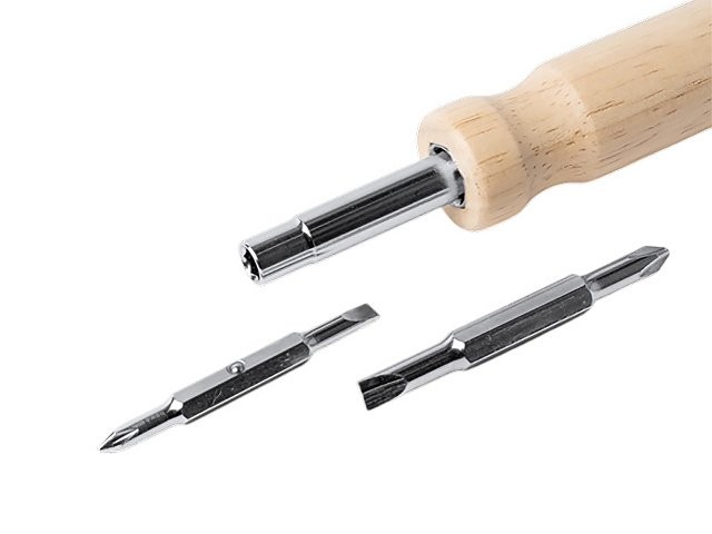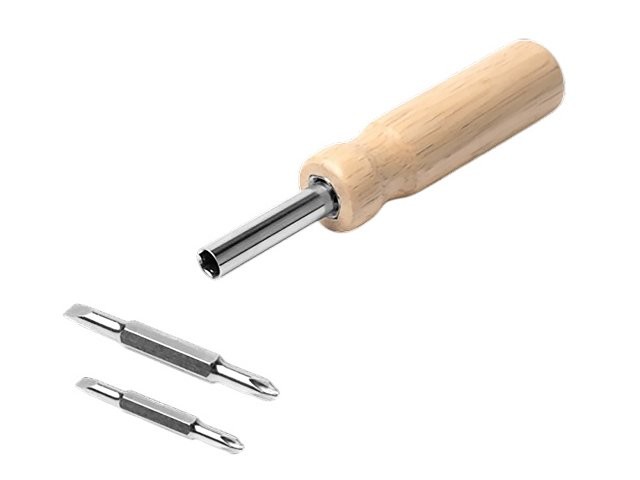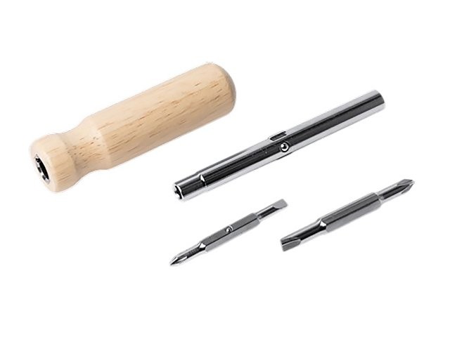 Расчет нанесенияОтвертка из нержавеющей стали с круглой деревянной ручкой. В комплекте две биты с 2 насадками под крестовую и плоскую отвертки.