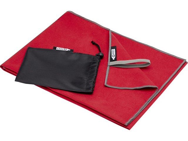 Спортивное полотенце Pieter очень хорошо впитывает влагу, легкое, быстро сохнет, а ткань прочная и очень мягкая. Когда полотенце сложено и закреплено резинкой, оно уменьшается до небольшого размера, поэтому его удобно брать с собой в тренажерный зал, бассейн, на пешую прогулку или в поход. Полотенце размером 50 х 100 см изготовлено из 90 % переработанного полиэстера GRS и 10 % нейлона. Его можно стирать в стиральной машине при температуре 40 °C. В комплект поставки входит мешок для хранения (17 x 13 см), изготовленный из переработанного ПЭТ-пластика, обеспечивающий большую площадь для печати логотипа. 90% Переработанный Полиэстер, 10% Нейлон, 200 g/m2.