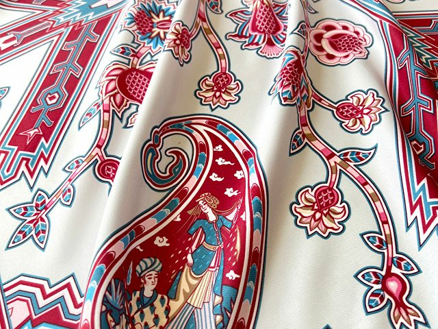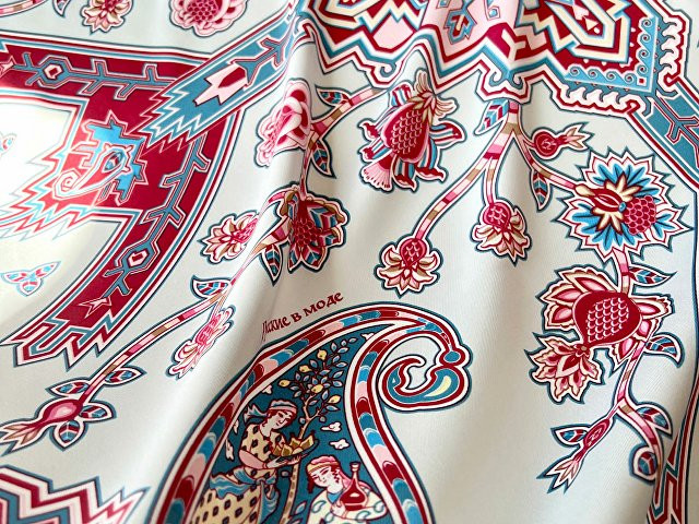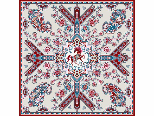 Дизайн платка "Кавказский скакун" от бренда “Русские в моде” by Nina Ruchkina навеян прекрасным и загадочным Востоком, вдохновляющим творцов всего мира. В центре принта аксессуара изображена гордая лошадь - один из главных символов величественного Кавказа, ассоциирующийся с дивной красотой, силой, смелостью и огнём. Изящный скакун окружён бутой - языками пламени, роскошными цветами плодородного граната, изящно простирающимися меж колоритного орнамента знаменитых восточных ковров. В каждом элементе буты можно увидеть национальные промыслы и традиционные музыкальные инструменты — лютню (удд), бубны, почитаемые народами дивного Востока. Этот платок идеально подойдет амбициозным, целеустремленным и уверенным в себе девушкам, стремящимся сделать каждый свой образ неповторимым! Дизайн: Нина Ручкина, Наталия Александрова.