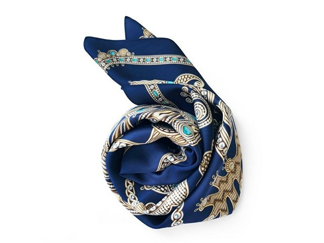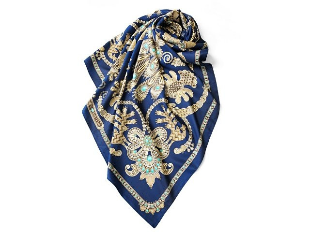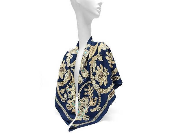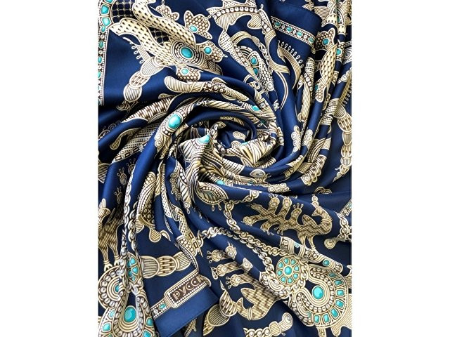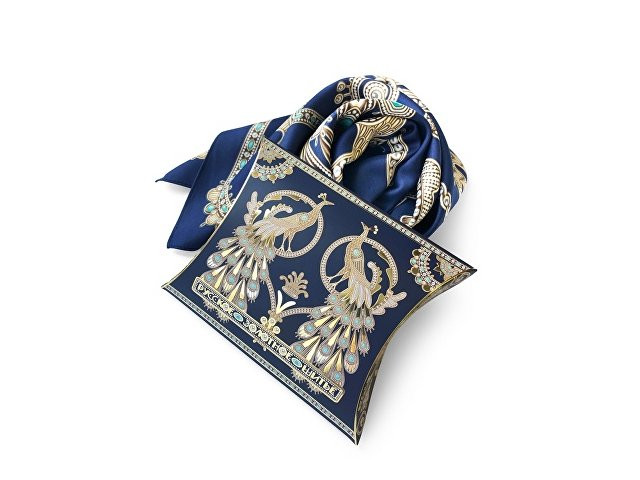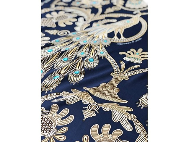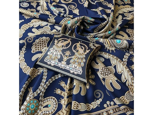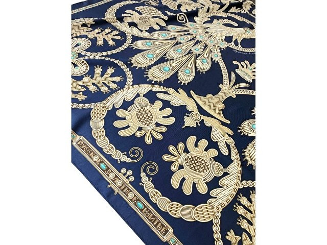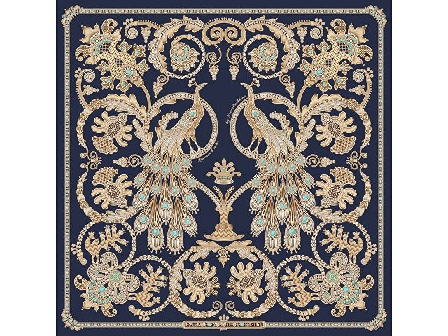 Платок «Русское золотное шитьё» посвящён драгоценному старинному русскому рукоделию. Дошедшие до нас памятники шитья, выполненные русскими мастерицами, являются произведениями высокой культуры. В изделиях сочетаются талант художника и тонкий вкус, духовное богатство, исполнительское мастерство вышивальщиц. В центре композиции излюбленный сюжет традиционного русского орнамента - царственные павлины. Они горделиво восседают в обрамлении из фантастических цветов и виноградных лоз. Павлин в русской культуре — это жар-птица, которая несет в себе солнечную энергию развития, поэтому это птица семейного счастья. Они всегда рассаживаются на свадебных рушниках. Павлин за красоту своих перьев стал символом расцвета, молодости. Про стройную, красиво одетую девушку говорят: «Будто пава плывет». Мы старались воссоздать в рисунке сложную фактуру древнего промысла, придав золотошвейному искусству новую форму. Желаем всем обладательницам платка «Русское золотное шитьё» наполниться энергией и тёплом посланий предков. А изысканная цветовая гамма платка сделает этот аксессуар незаменимым в гардеробе любой леди, неравнодушной к современной моде. Дизайн: Нина Ручкина, Наталия Александрова.