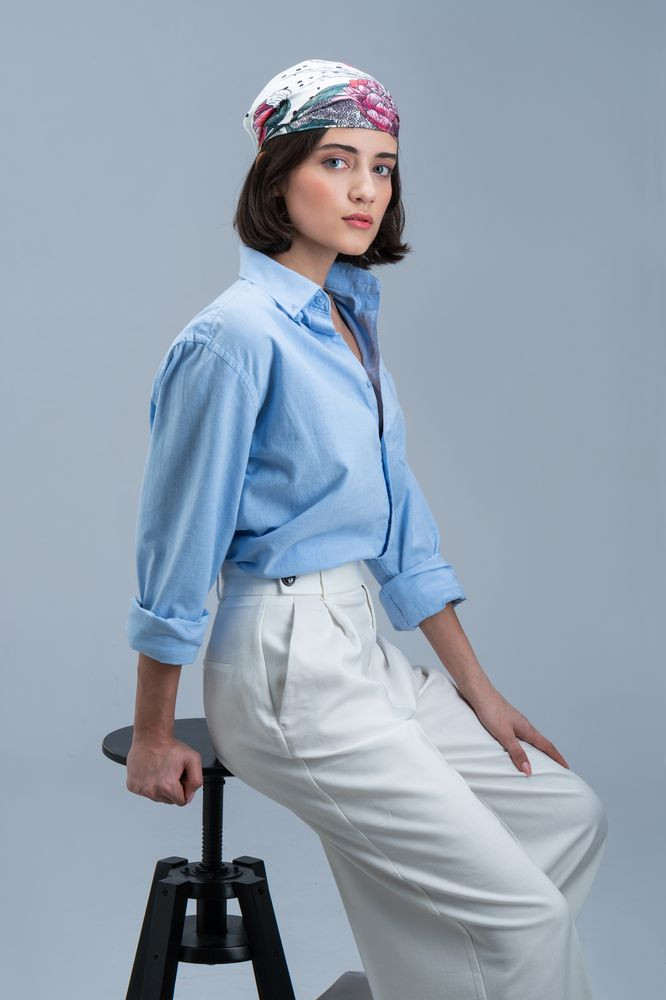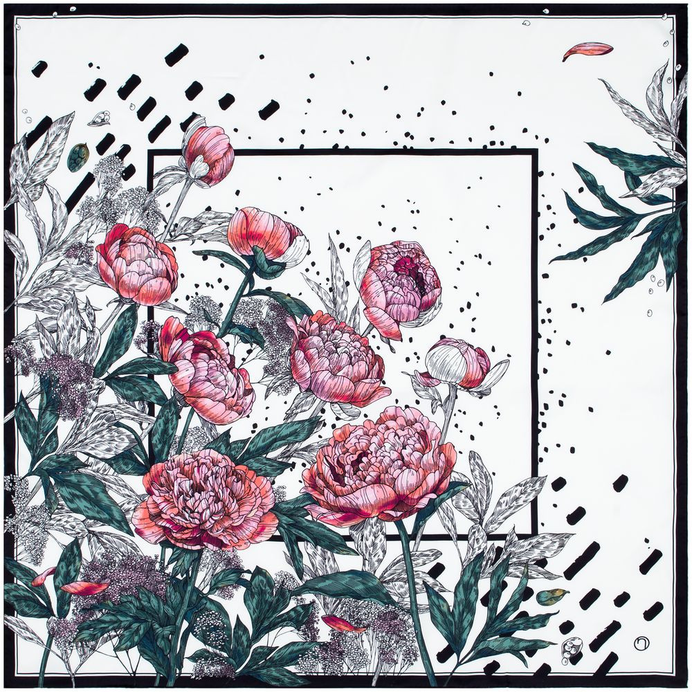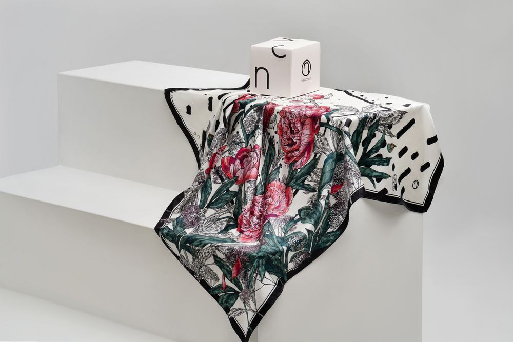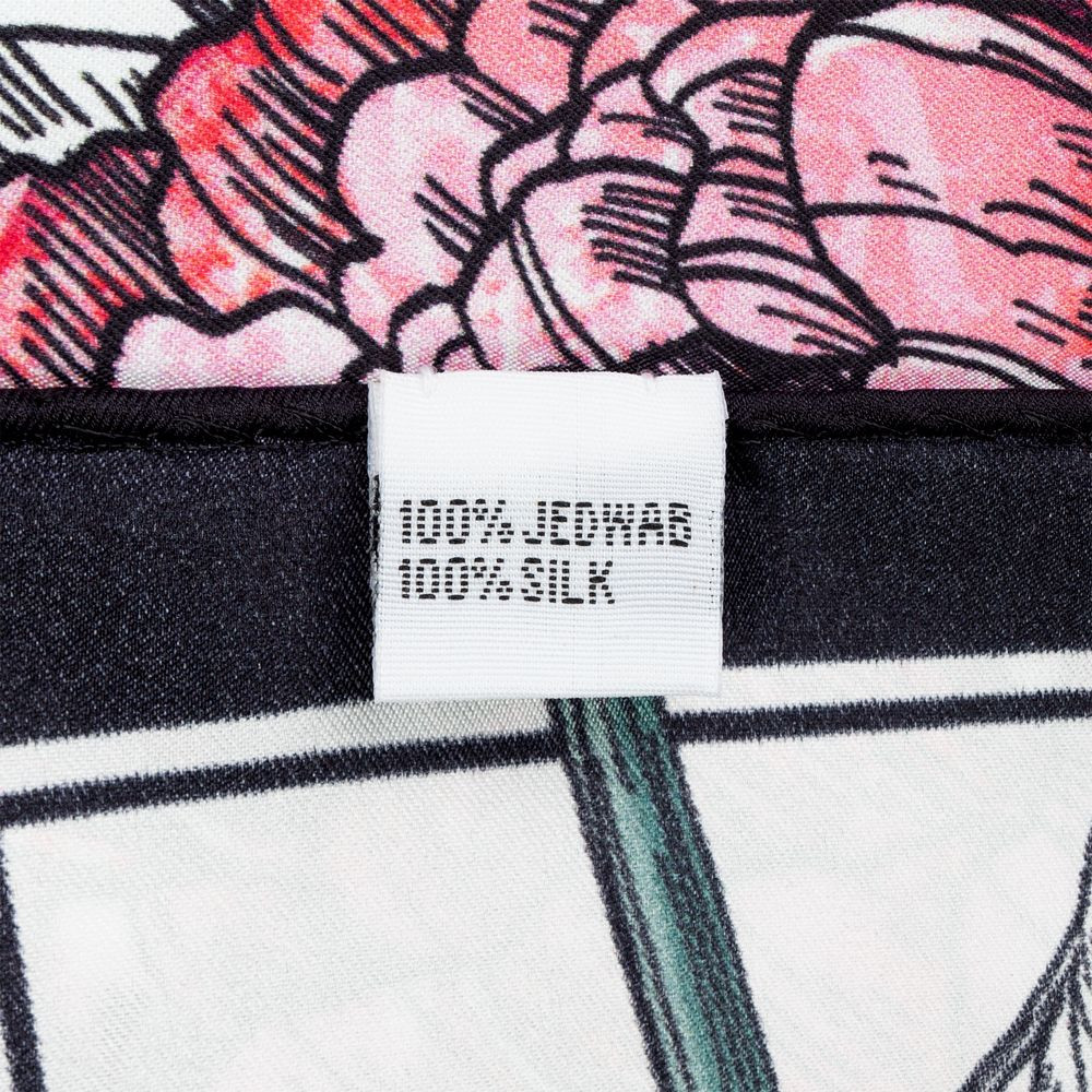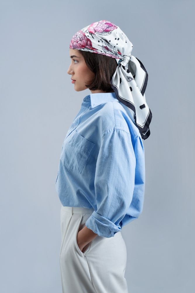 Шелковый платок с цветочным принтом открывает простор для фантазии — его можно использовать как шарф, головной убор или декоративный элемент для верхней одежды и аксессуаров.