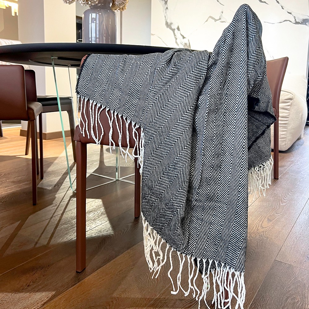 Плед SAMUM изготовлен из высококачественной акриловой пряжи, что позовляет добиться мягкости и тепла как от натуральной шерсти. Благодаря составу плед легкий, хорошо сохраняет теплоизолирующие свойства и надолго радует внешним видом. Также гипоаллергенен, не накапливает статическое электричество и легко стирается. Плед имеет классический узор “елочка”, с бахромой по краям. Для нанесения логотипа предусмотрена нашивка из кожзама (8 x 4 см). Плед упакован в пластиковый пакет, сложен в виде рулона с текстильным держателем.