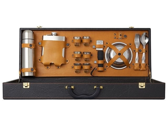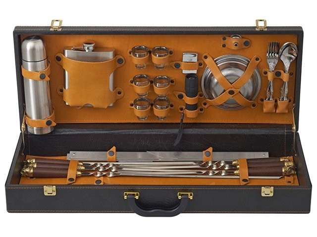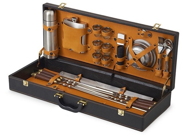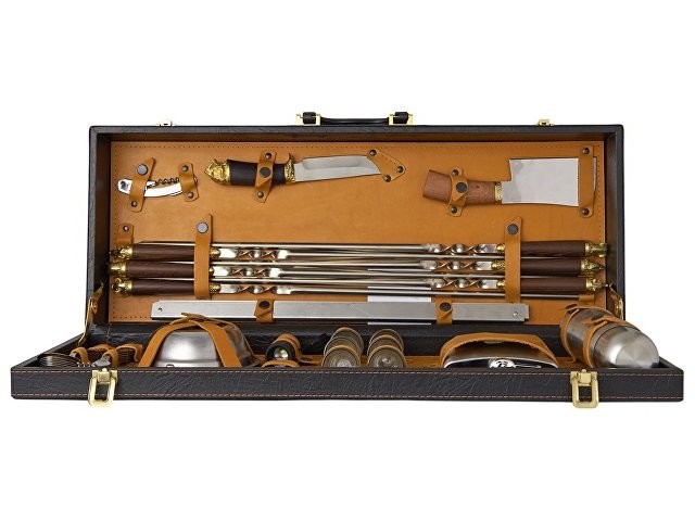 Кейс из сплит-кожи, с повышенной износостойкостью, внутренняя отделка натуральная кожа. Все аксессуары надежно крепятся к кейсу кожаными ремешками на кнопке, обеспечивая удобство транспортировки и сохранность содержимого. В комплект входит: Стопка 25 мл d4,2 х 5 см - 6шт Термос 500 мл d6,9 х 24,5 см - 1шт Фляга 250 мл - 12,7 х 16,7 х 2,9см - 1шт Зажигалка- 3,8 х 5,7 х 1,3см- 1 шт Фонарь- d3,4 х 11,4см- 1шт Воронка- d3,7 х 2,4см- 1шт Тарелка- d15 х 4,5см -1шт Вилка 19 х 2,5 х 1,7 см - 6шт Ложка 19 х 4,5 х 2,5 см - 6шт Нож 26 х 4,3 х 2,8 см - 1шт Нож Топорик- 24 х 6,8 х 2,2см - 1шт Ножки для мангала 50,3 х 31 х 0,9 см - 2шт Шампур d2,3 х 65,3 см - 6шт Штопор 11 х 2,5 х 0,9см - 1шт