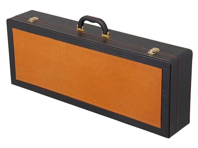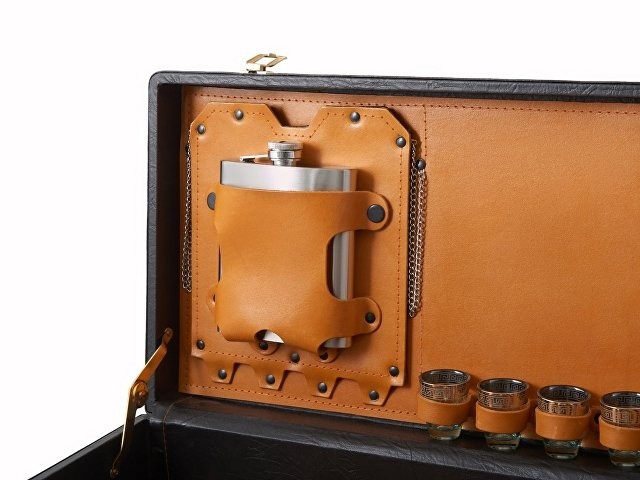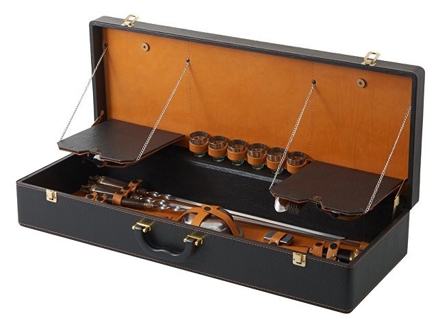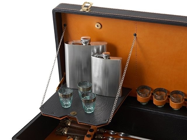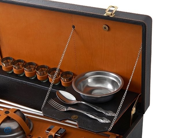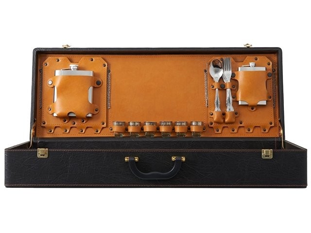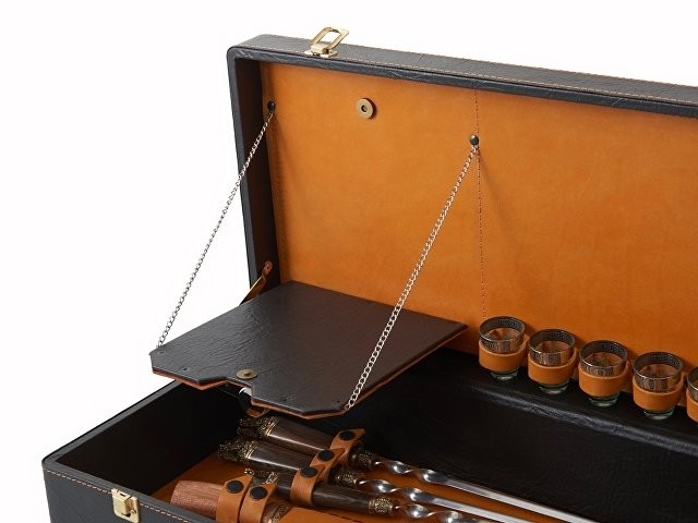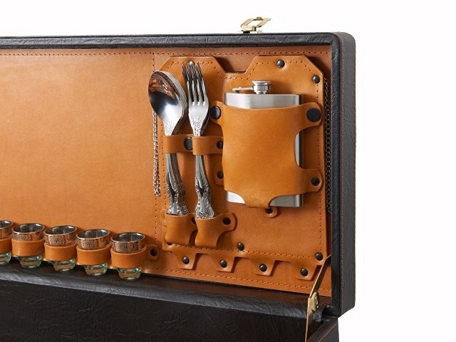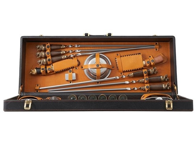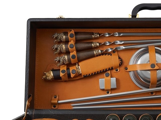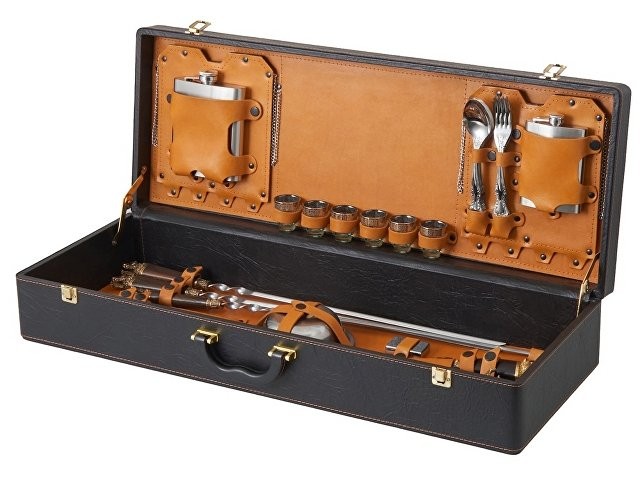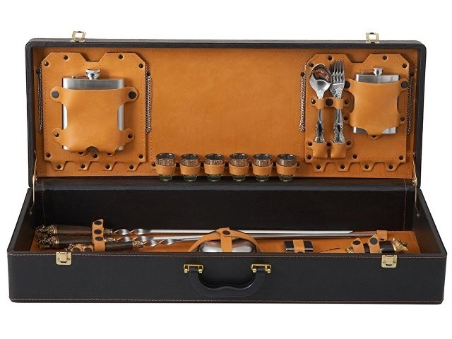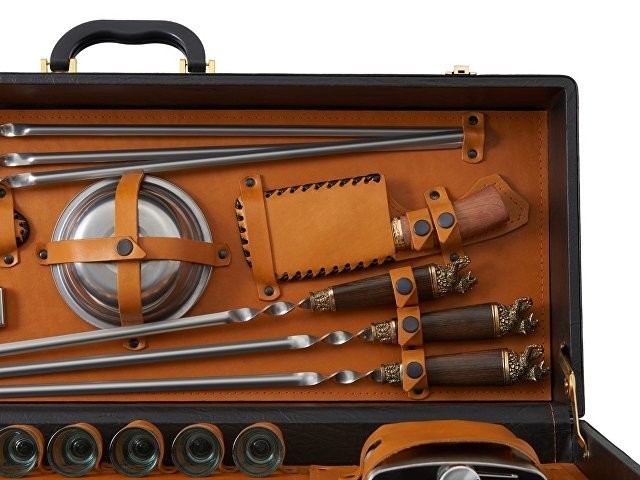 Кейс из сплит-кожи, с повышенной износостойкостью, внутренняя отделка натуральная кожа. Все аксессуары надежно крепятся к кейсу кожаными ремешками на кнопке, обеспечивая удобство транспортировки и сохранность содержимого. В комплект входит: - шампура большие- 6 шт - фляга 500 мл - фляга 250 мл - тарелка- 6 шт - вилка- 6 шт - ложка- 6 шт - стопка 25 мл- 6 шт - нож "Тяпка" - нож разделочный - зажигалка