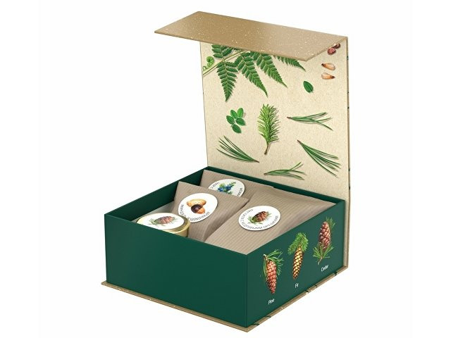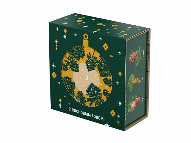 Аромат и вид хвои – символ Рождества и Нового года. «Хвойная» шкатулка «С сосновым годом!» оформлена праздничным паттерном и изображением шишек разных хвойных деревьев. На крышке шкатулки помещена иллюстрация, изображающая вид снизу вверх на звёздное небо и уходящие ввысь сосны. При надевании на шкатулку шубера (суперобложки) с круглым отверстием, на крышке шкатулки появляется вырубное изображение новогоднего шарика. Состав: Варенье из шишек (40г): шишки сосновые, сахар, вода. Чай с пихтой и ягодами можжевельника (50г): черный чай, хвоя пихты, ягоды можжевельника. Пастила с кедровыми орешками (50г): яблоко, яичный белок, кедровые орехи. Миндаль в шоколадной глазури (40г): шоколадная глазурь (сахар-песок, эквивалент какао-масла, эмульгаторы, антиокислитель (Е306), какао порошок эмульгатор (Е476), аромативатор «Ванилин», миндаль, сахарная пудра, масло какао, глазирователь.