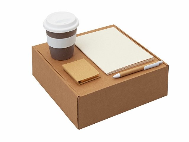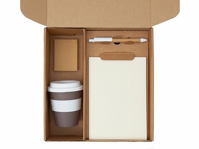 Материал: блокнот- бумага из переработанных тетра-паков, ручка- картон, пластик, стакан- 50% бамбуковое волокно, 50% полипропилен, коробка- картон
