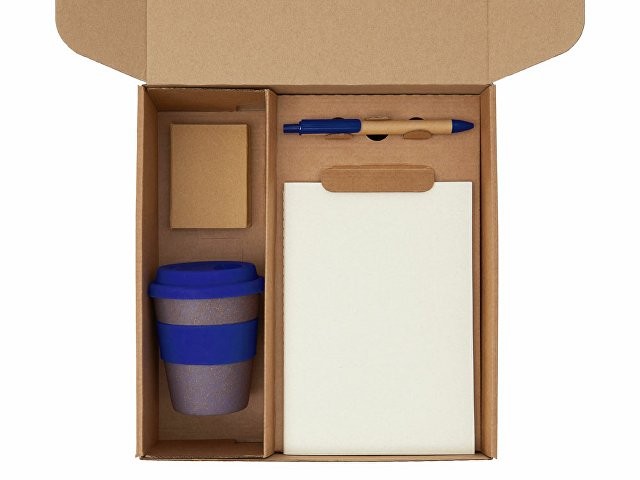Материал: блокнот- бумага из переработанных тетра-паков, ручка- картон, пластик, стакан- 50% бамбуковое волокно, 50% полипропилен, коробка- картон