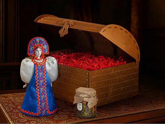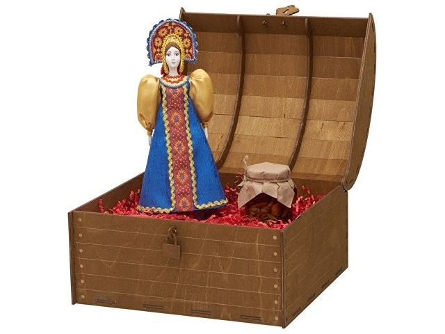 Подарочный набор словно сошёл со страниц русской сказки: в нём гармонично переплелись изящество ручной работы и щедрость родной природы. Каждый элемент продуман до мелочей, чтобы создать неповторимую атмосферу тепла и исконно русского гостеприимства. Комплектация: 1. Фарфоровая кукла в народном костюме ручной работы: Яркий расшитый сарафан и традиционный кокошник с изящной вышивкой. 2. Натуральный мёд с грецким орехом (250 г): Отборный цветочный мёд с грецким орехом. Упакован в стеклянную баночку с винтовой крышкой. 3. Декор из бумажной стружки придаёт композиции глубину и благородство, бережно сохраняя все элементы набора. 4. Деревянный сундук с изящным замочком превращает вручение подарка в особый ритуал. Дополнительное брендирование шильдом спектрум делает презент эксклюзивным и памятным. Для ценителей аутентичных сувениров и изысканных вкусов.