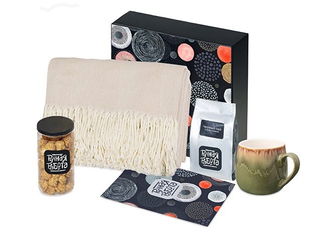 Материал: плед - 100% хлопок, кружка - костяной фарфор с покрытием софт-тач, чай - пластик, попкорн - пластик, металл, мешок - нетканый материал (спанбонд), коробка - картон