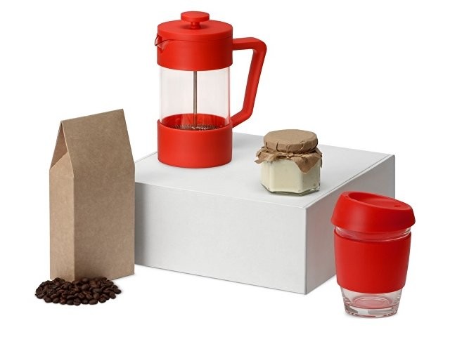 Набор "Бодрое утро" содержит все необходимое для действительно приятного пробуждения. В нем вы найдете все, что нужно для приготовления вашей первой чашечки кофе с утра: френч-пресс, упаковку робусты темной обжарки, стакан с силиконовыми деталями и баночку крем-меда, который составит прекрасную пару крепкому напитку. Набор упакован в белую картонную коробку и переложен бумажным наполнителем.
