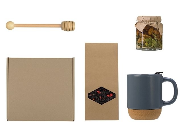 Материал: кружка - керамика, пробка, мед в банке - стекло, ложка - бамбук, чай - крафт-коробка, коробка - картон