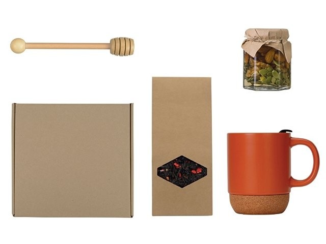 Материал: кружка - керамика, пробка, мед в банке - стекло, ложка - бамбук, чай - крафт-коробка, коробка - картон