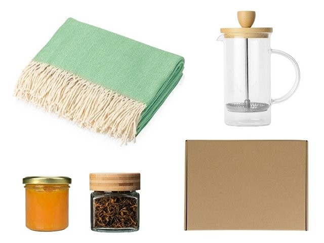Подарочный набор с пледом, френчпрессом, чаем и вареньем, зеленый