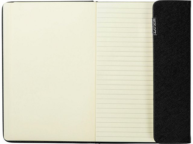 Эксклюзивный блокнот формата A5 с обложкой из термополиуретана, черной лентой-закладкой, застежкой на магните и 80 линованными листами (80 г/м²) кремового цвета. Предлагается с шариковой ручкой.