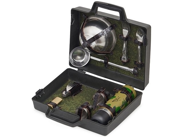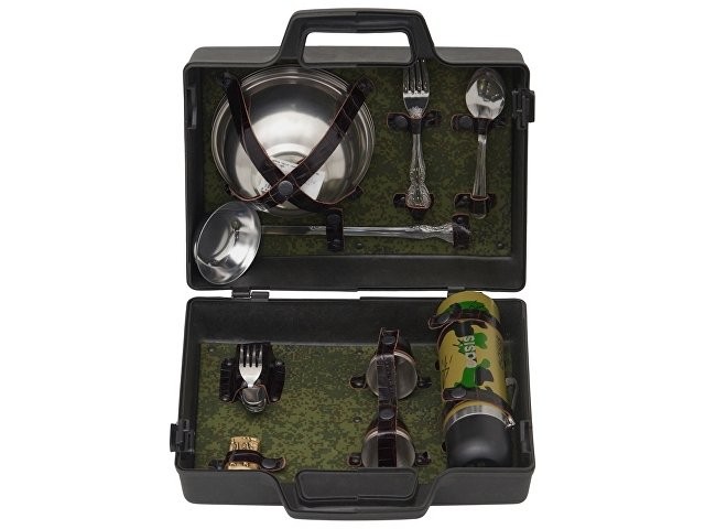 Подарочный набор для пикника. Этот комплект содержит все необходимое для комфортного и практичного времяпрепровождения на свежем воздухе. Вас ждут: - 6 мисок из нержавеющей стали (500 мл) — легкие и долговечные, идеально подходят для порционных блюд и закусок. - 6 вилок и 6 ложек из нержавеющей стали — надежные и стильные столовые приборы, которые сделают прием пищи удобным и приятным. - 6 стопок из нержавеющей стали — для дружеских тостов и веселых встреч на природе. - Половник — необходимый аксессуар для сервировки супов и горячих блюд. - Термос (500 мл) — для хранения ваших любимых напитков и поддержания жажды во время активного отдыха. - Складной туристический нож — многофункциональный инструмент для приготовления пищи и решения повседневных задач. - Зажигалка — для быстрого разжигания костра и создания уюта. Все элементы набора выполнены из качественной нержавеющей стали, что обеспечивает долговечность и легкость в уходе. Упакованы в пластиковый кейс и надежно закреплены ремешками из натуральной кожи, что обеспечивает удобство транспортировки и сохранность содержимого.