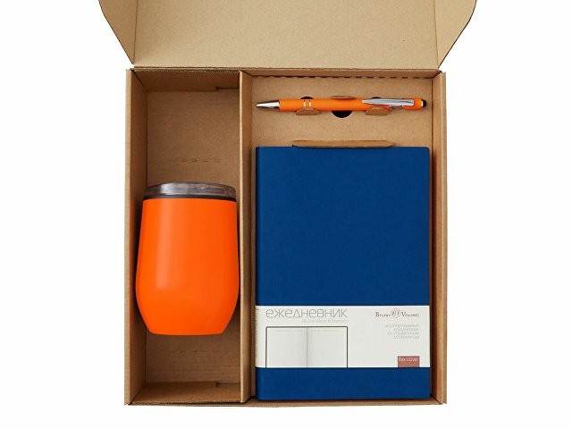 Материал: ежедневник - искусственная кожа, термокружка - нержавеющая сталь снаружи, полипропилен внутри, ручка - металл c покрытием софт-тач, ситечко - нержавеющая cталь