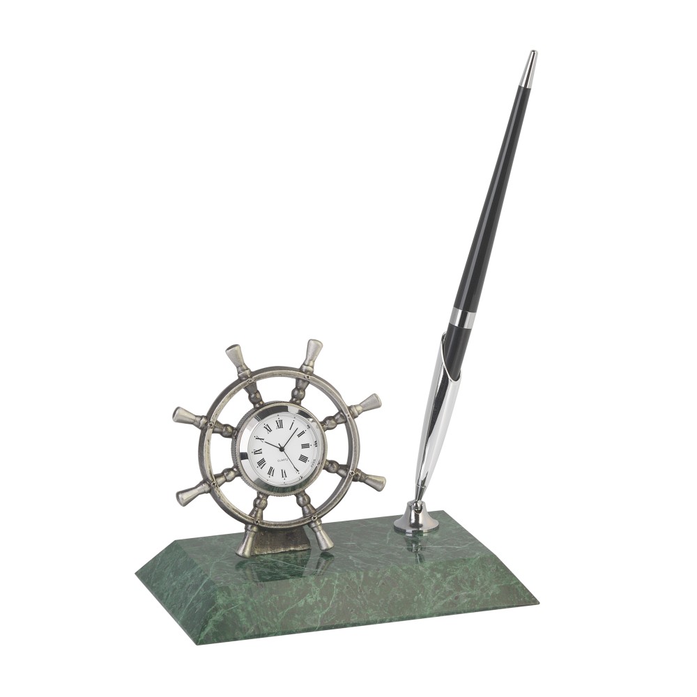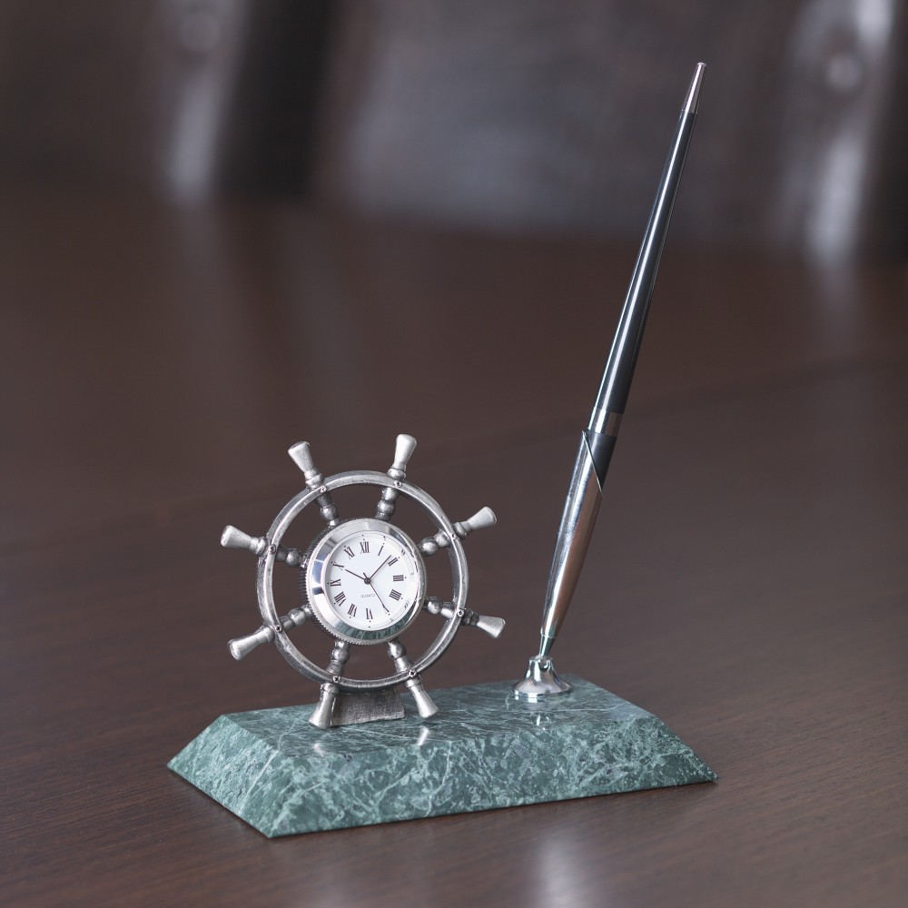 Бизнес — сложная задача, с которой могут справиться настоящие асы. Лидерам, свойственно быть «за штурвалом», т.к. от их действий зависит достижение конкретной цели и судьба корабля! Представляем символичный подарок для профессионалов своего дела — настольная подставка со штурвалом-часами и ручкой. Основание выполнено из мраморной крошки, штурвал и ручка металлические с хромированным покрытием. Этот полезный аксессуар украсит рабочий стол и станет неотъемлемой деталью интерьера!