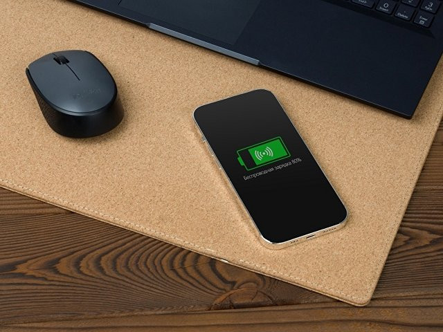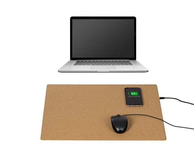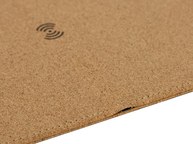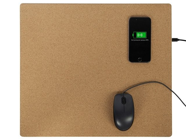 Большой (45 х 40 см) коврик из пробки для мышки, который может заряжать Qi-совместимые устройства методом беспроводной зарядки. Коврик позволяет разместить не только мышку, но и небольшой ноутбук или планшет. Коврик решает проблему скольжения мышки, обеспечивает бесшумное перемещение мыши по поверхности, позволяет декорировать интересным способом рабочее место. В комплекте длинный зарядный кабель 100 см. Коврик не складывается. - беспроводная зарядка на 5 Вт - разъем micro USB - большой размер поля для нанесения - кабель 100 см в комплекте