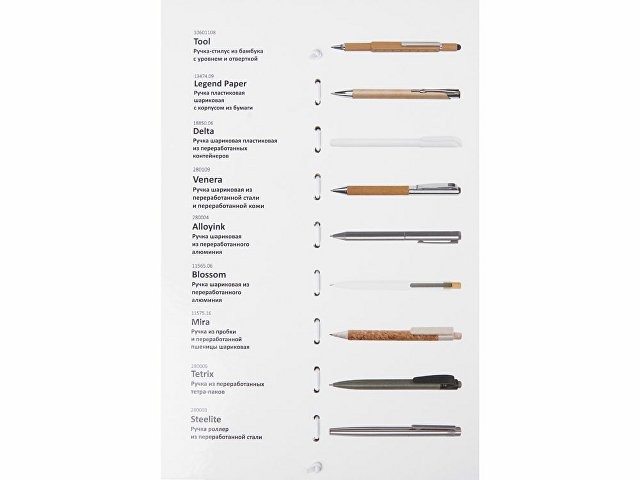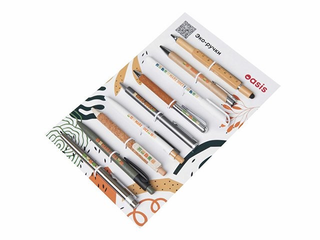 Промо-сет ЭКО ручек — это презентационный комплект, включающий 9 уникальных моделей с несколькими вариантами нанесения: УФ-печать, тампопечать. В сете представлены самые хитовые позиции категории ЭКО, а также новинки каталога периода зима-весна 2026 года. Все образцы аккуратно закреплены на стильной картонной подложке при помощи резинового фиксатора. На обратной стороне указаны названия и краткое описание моделей. Промо-набор — идеальный инструмент для презентаций: клиенты могут подержать ручки в руках, опробовать их на письме и наглядно увидеть различия между видами нанесения. При этом все самые важные модели собраны в одном легком и компактном наборе.