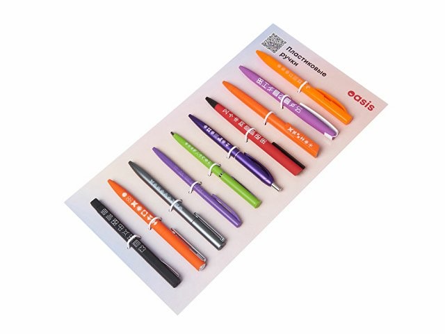 Промо-сет пластиковых ручек — это презентационный комплект, включающий 10 уникальных моделей с несколькими вариантами нанесения: УФ-печать, тампопечать и трафаретная печать. В сете представлены самые хитовые позиции категории пластиковых ручек, а также новинки каталога периода зима-весна 2026 года. Все образцы аккуратно закреплены на стильной картонной подложке при помощи резинового фиксатора. На обратной стороне указаны названия и краткое описание моделей. Промо-набор — идеальный инструмент для презентаций: клиенты могут подержать ручки в руках, опробовать их на письме и наглядно увидеть различия между видами нанесения. При этом все самые важные модели собраны в одном легком и компактном наборе.
