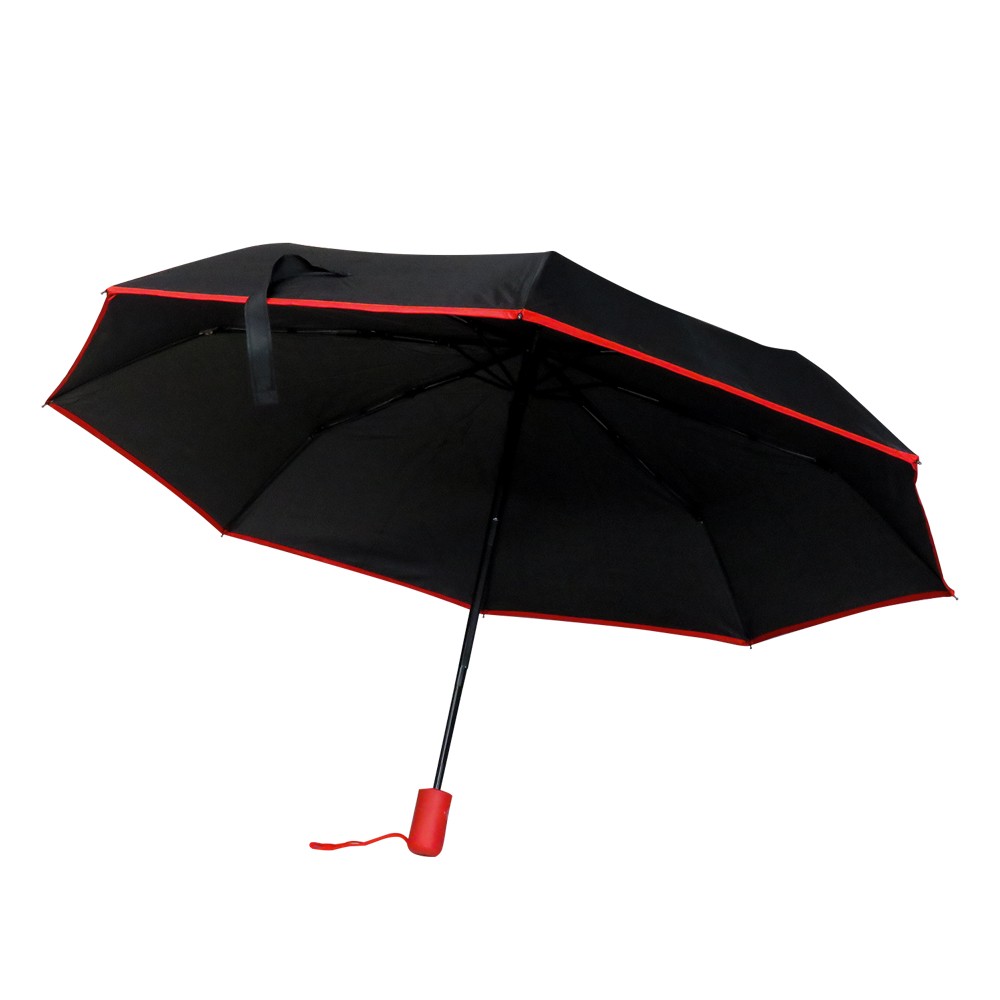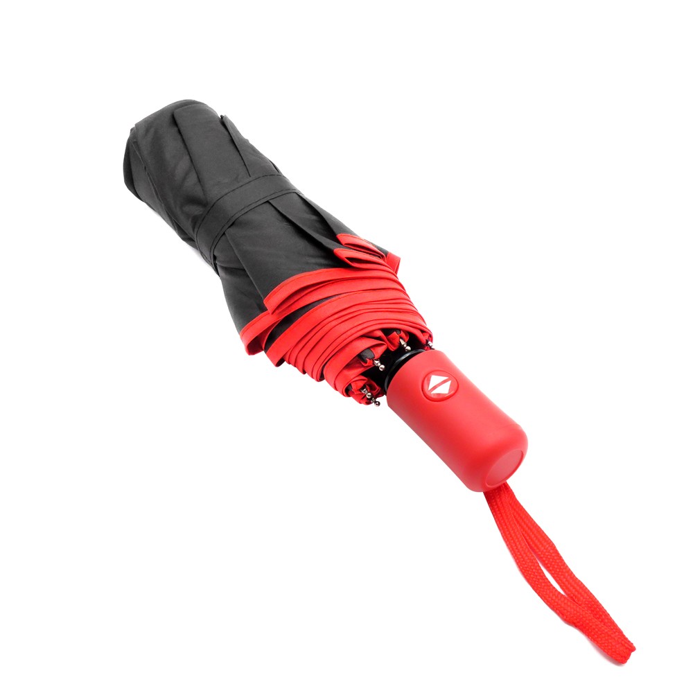Противоштормовой автоматический зонт Line выполнен из ткани эпонж 190T. На таком материале вода превращается в капельки и скатывается, а сам зонт остается сухим. Черный металлический каркас с ветрозащитной функцией. Спицы из стекловолокна, а специальное устройство препятствует поломке спиц при резких порывах ветра. Ручка софтач (цвет по PANTONE® максимально приближен 187C) - в тон строчке по краю зонта.