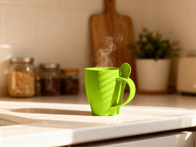 Кружка «Nina» состоит из смеси ПП-пластика (50%) и переработанной пшеницы (50%), что делает ее настоящим экомерчем. Поверхность кружки имеет приятный бежевый оттенок с небольшими вкраплениями-точками темно-серого цвета, которые только подчеркивают природное происхождение «Nina». В остальном — и тактильно, и внешне, и по своим качествам — кружка не отличается от обычной пластиковой: ее тоже нельзя использовать в посудомойке и микроволновой печи, а также заливать напитки температурой выше 100 градусов Цельсия. Объем «Nina» — 300 мл, что является самым, пожалуй, популярным вариантом: кружка не слишком маленькая, не слишком большая, а в самый раз.