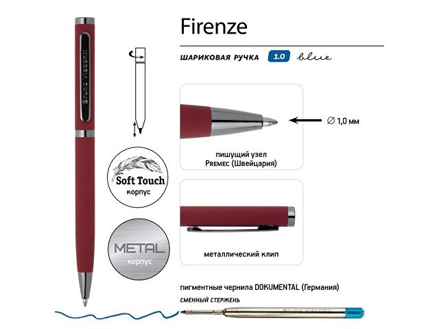Шариковая металлическая ручка из коллекции «Firenze» от Bruno Visconti - бизнес-аксессуар, с которым вы всегда будете чувствовать себя уверенно и комфортно. Лаконичный дизайн, прочный металлический корпус, строгость формы подчеркнут статус владельца ручки. Удобство в эксплуатации и тактильно приятные ощущения подарит бархатистое покрытие Soft Touch. Ручка автоматическая, с легким поворотным механизмом подачи стержня. Надежный пишущий узел d 1,0 мм (от швейцарского производителя Premec) гарантирует высокое качество также, как и пигментные чернила Dokumental (Германия). Благодаря им писать ручкой «Firenze» одно удовольствие – она мягко скользит по поверхности бумаги, оставляя ровную, четкую линию.