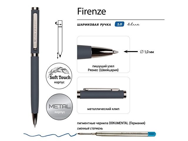 Шариковая металлическая ручка из коллекции «Firenze» от Bruno Visconti - бизнес-аксессуар, с которым вы всегда будете чувствовать себя уверенно и комфортно. Лаконичный дизайн, прочный металлический корпус, строгость формы подчеркнут статус владельца ручки. Удобство в эксплуатации и тактильно приятные ощущения подарит бархатистое покрытие Soft Touch. Ручка автоматическая, с легким поворотным механизмом подачи стержня. Надежный пишущий узел d 1,0 мм (от швейцарского производителя Premec) гарантирует высокое качество также, как и пигментные чернила Dokumental (Германия). Благодаря им писать ручкой «Firenze» одно удовольствие – она мягко скользит по поверхности бумаги, оставляя ровную, четкую линию.