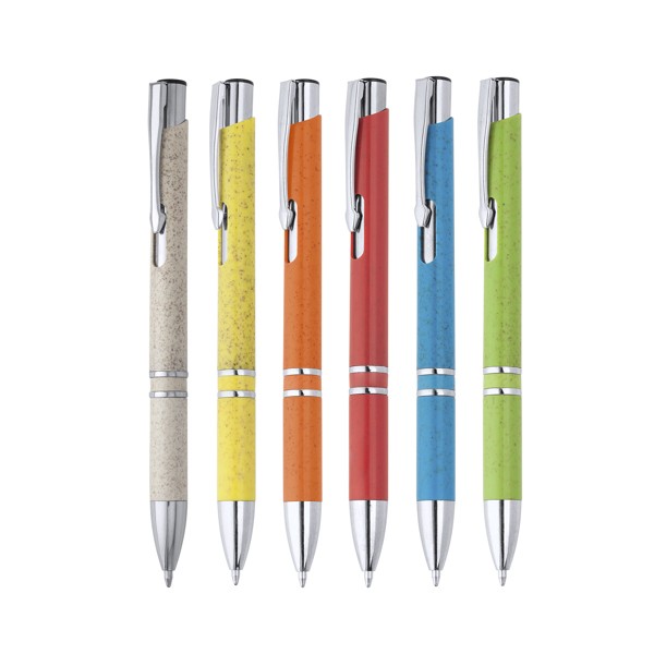 Кнопочная ручка из пшеничного волокна и АБС с серебряными деталями. Джамбо-заправка синими чернилами. Пшеничное волокно и ABS.