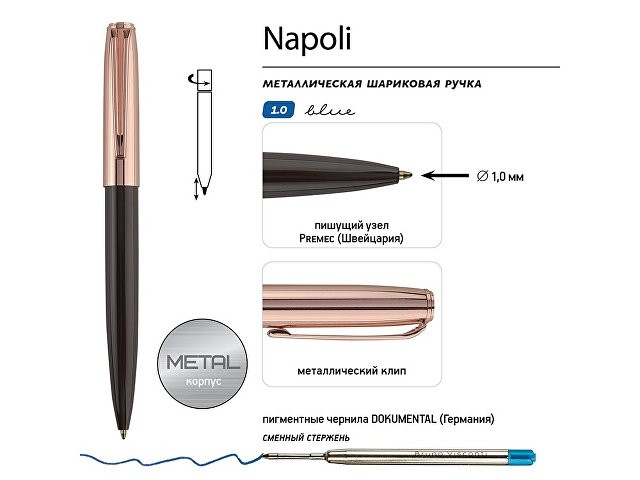 Шариковые автоматические ручки серии Napoli от Bruno Visconti – яркие, практичные, комфортные в работе, обладающие неизменным изяществом и высоким качеством исполнения: • пигментные чернила Dokumental от немецкого производителя • пишущий узел диаметром 1,0 мм Premec от швейцарского производителя • мягкое письмо • поворотный механизм подачи стержня • металлический корпус со специальным покрытием GLOSSY PRO • классические цвета на контрасте с цветом розового золота, золота, серебра или вороненой стали – тренд сезона.