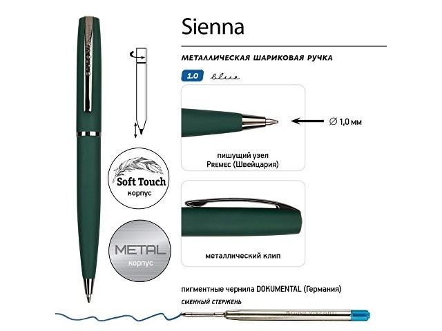 Ручка металлическая шариковая "Sienna", софт-тач, 1.0 мм, зеленый