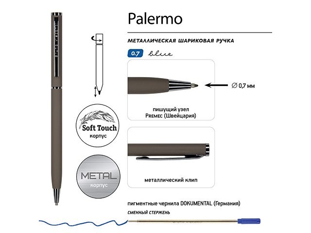 Ручка шариковая автоматическая BrunoVisconti® "PALERMO" цвет корпуса серый, soft-touch, 0.7 мм