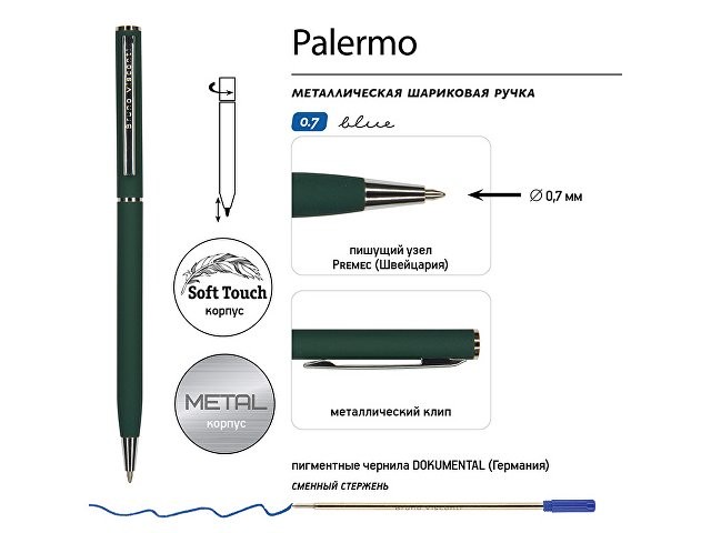 Автоматическая металлическая ручка "Bruno Visconti" серии "Palermo" однотонного цвета порадует любителей всего изящного и утонченного. Покрытие корпуса Soft Touch гарантирует дополнительный комфорт в работе с ней. Стержень легко выдвигается благодаря поворотному механизму. Синие пигментные чернила Dokumental (Германия) и пишущий узел Premec (Швейцария) обеспечивают качественное и мягкое письмо.
