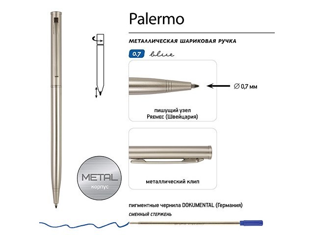 Автоматическая металлическая ручка "Bruno Visconti" серии "Palermo" однотонного цвета порадует любителей всего изящного и утонченного. Стержень легко выдвигается благодаря поворотному механизму. Синие пигментные чернила Dokumental (Германия) и пишущий узел Premec (Швейцария) обеспечивают качественное и мягкое письмо.