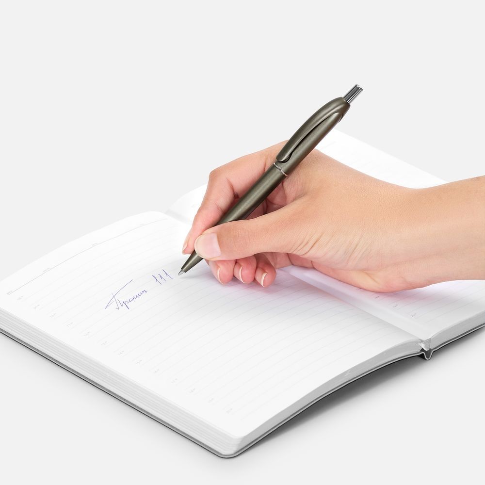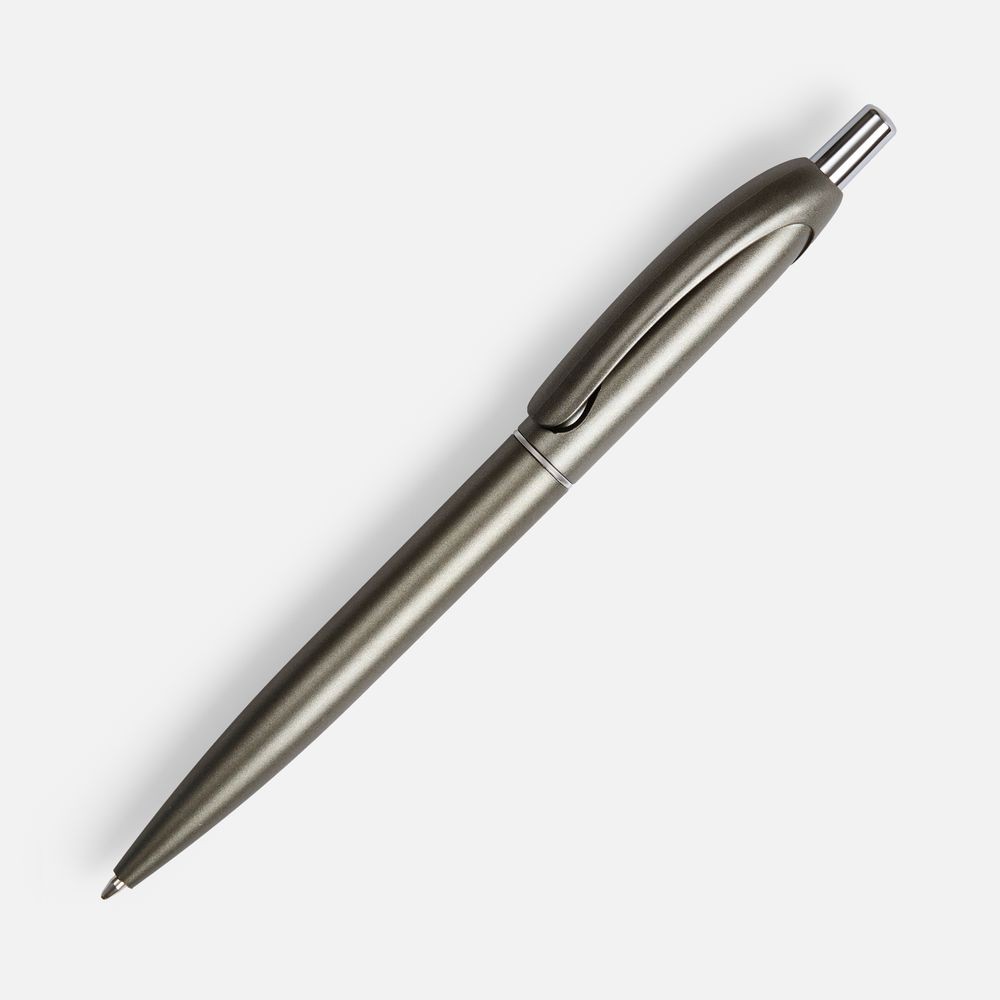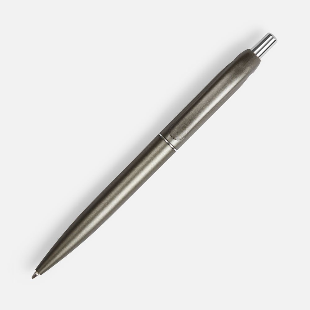 Шариковая пластиковая ручка в корпусе с эффектом «металлик» и серебристыми деталями. Приятная округлая форма клипа добавляет ручке плавности и объема.