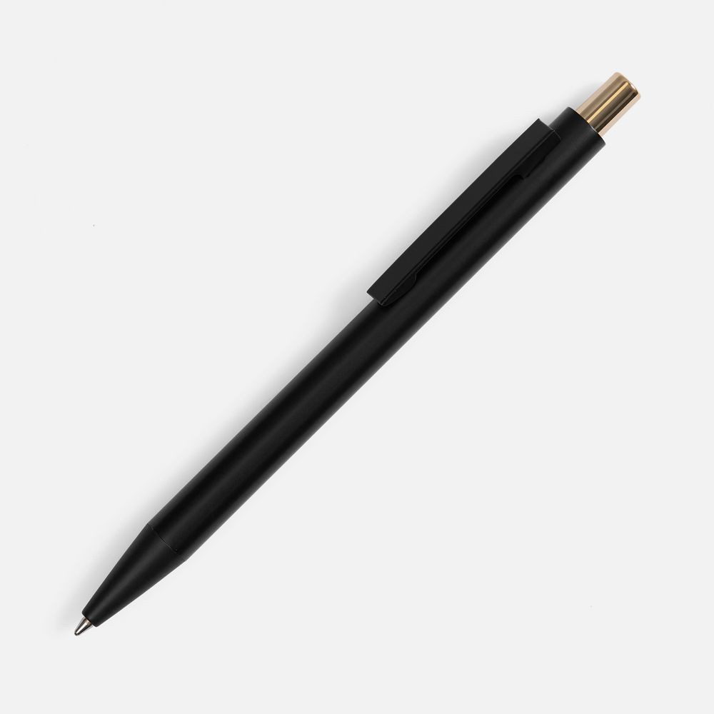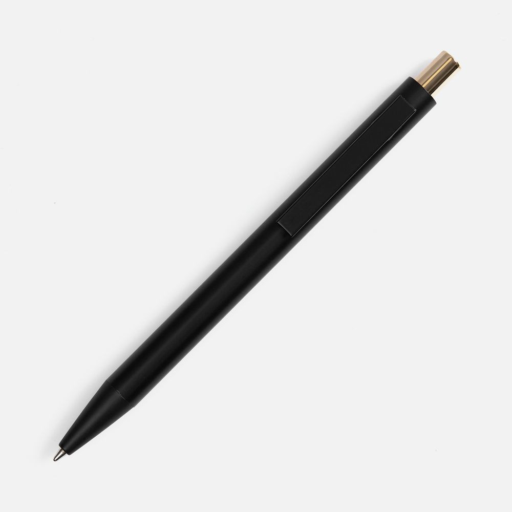 Ручка строгих форм в черном матовом корпусе с цветными деталями, которая точно может удивить, — гравировка на ней вскрывается цветом в тон кнопке.