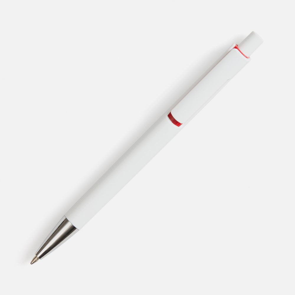 Шариковая ручка с глянцевым белым корпусом и цветовым акцентом у клипа, который дополнит логотип компании.