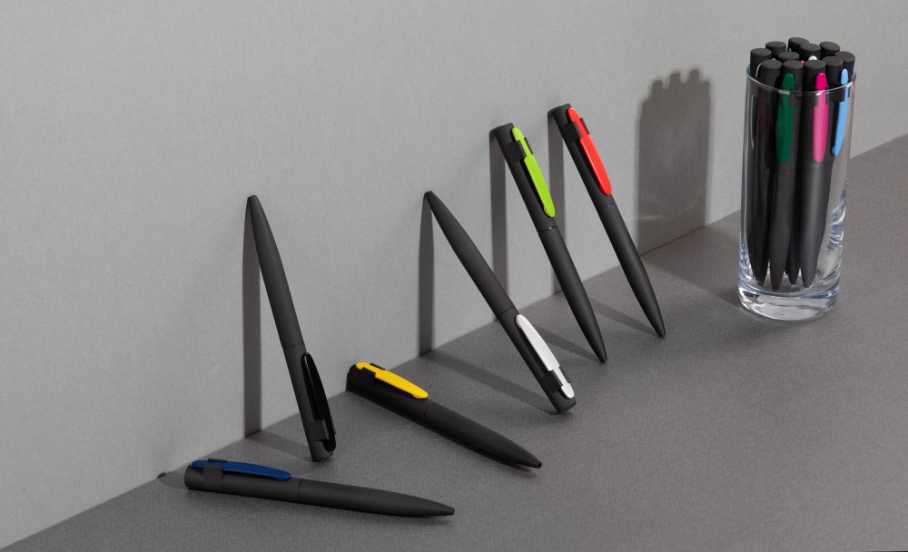 Оригинальное сочетание черного корпуса ручки в покрытии SOFTGRIP, обеспечивающем лёгкий массажный эффект, c цветным металлическим матовым клипом.