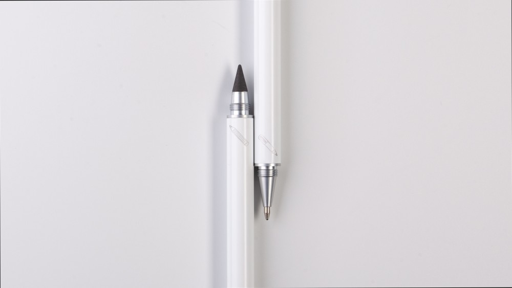 Набор из 2х письменных принадлежностей в едином корпусе - шариковой ручки и вечного карандаша, грифель которого выполнен из сверхпрочного графита с длиной письма до 30 000 метров, Закручивающиеся колпачки надёжно сохраняют пишущие узлы от внешних воздействий.