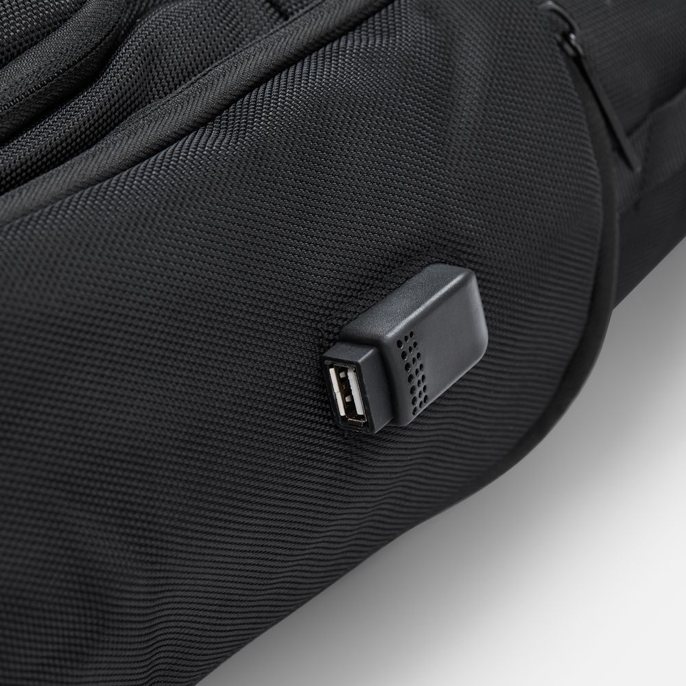 - Внешний USB-порт для зарядки гаджетов (внутри бокового кармана — провод для подключения)