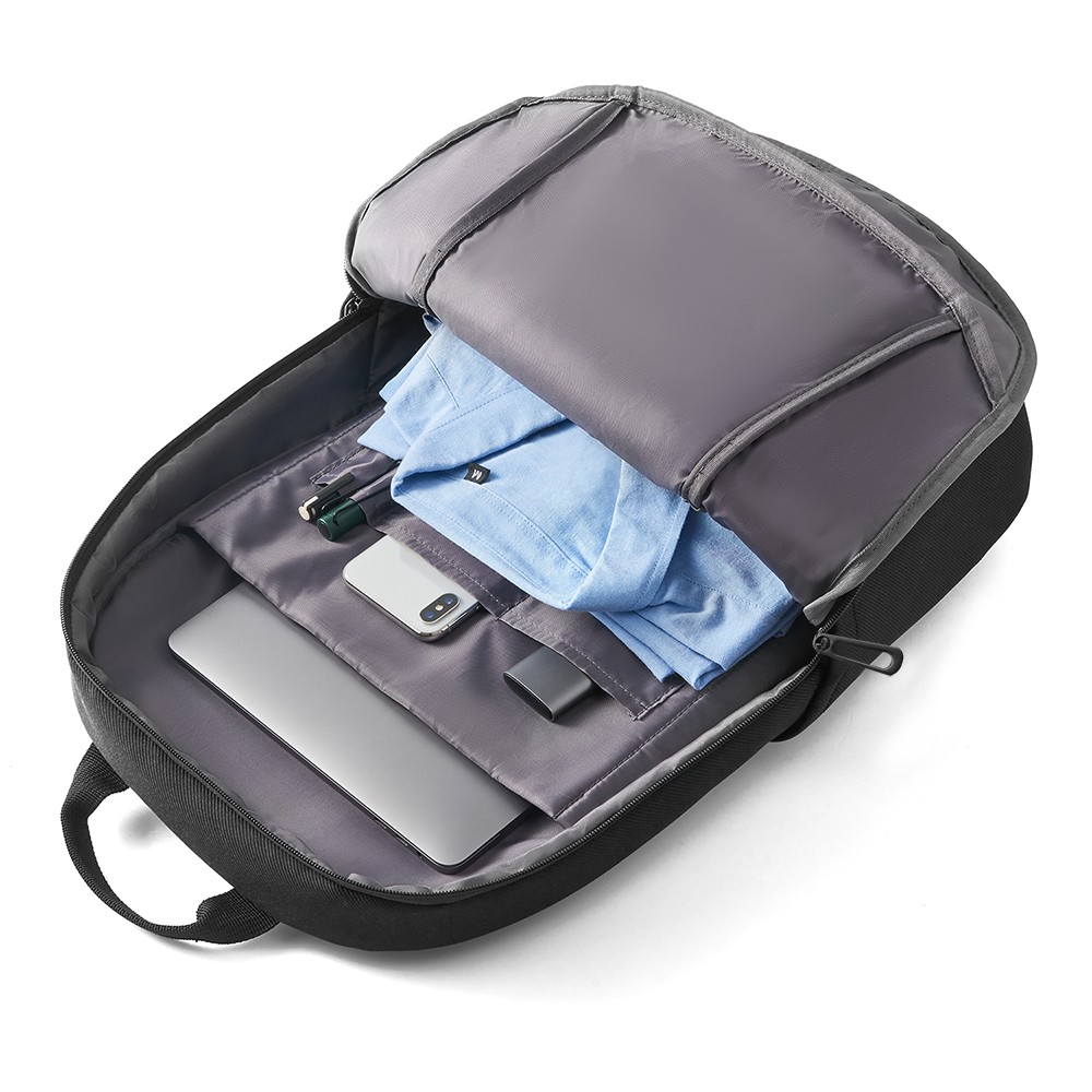 Стильный городской рюкзак GENER. Его особенности - сочетание элементов из искусственной кожи, высококачественного ультрапрочного полиэстера саржевого переплетения с обтекаемым футуристичным дизайном. Вертикальный антикражный карман на задней стенке - ваши документы в безопасности и всегда под рукой (при ношении рюкзака на правом плече). Дополнительные петли из тесьмы на плечевых ремнях для крепления различных аксессуаров и гаджетов. Верхняя часть из искусственной кожи надёжно защищает содержимое от попадания влаги внутрь, устойчива к широкому диапазону температур и служит дополнительным местом для кастомизации. Одно большое отделение на молнии и 2 наружных открытых кармана позволяют разместить всё необходимое. Внутри уплотненный карман для ноутбука 17 дюймов и карман-органайзер для мелких аксессуаров. 3D-сетка на задней стенке и подкладке плечевых ремней предотвращает скольжение и обеспечивает дополнительную вентиляцию и комфорт при контакте с кожей и одеждой. Двойное уплотнение задней стенки распределяет вес и снижает нагрузку на позвоночник. Уплотнённые плечевые ремни регулируются по длине. Специальная накладка для чемодана на задней стенке делает его незаменимым спутником для путешествий. Мешок-пыльник из нетканого материала даёт дополнительное место для кастомизации и надежно защищает ваш рюкзак во время хранения и транспортировки. Размер: 47*32*15 см Материал товара: Полиэстер с водонепроницаемой пропиткой Плотность: 1000D Рекомендуемая максимальная нагрузка: не более 10 кг. Вместимость: 17 л. Вес: 0.51 кг Возможно добавление пуллеров (арт. 4093) в количестве 2 шт в семи вариантах цвета и нанесение на них УФ печати Возможна кастомизация с помощью ремувки (арт. 4094, 4097) в восьми вариантах цвета и нанесение на неё термопечати