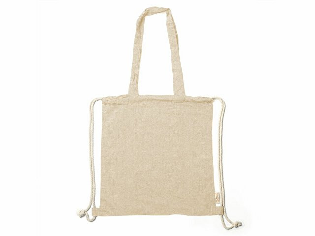 Рюкзак-мешок из переработанного хлопка плотностью 140 г/м² с меланжевой отделкой, ручками длиной 70 см в тон и шнурками натурального цвета.