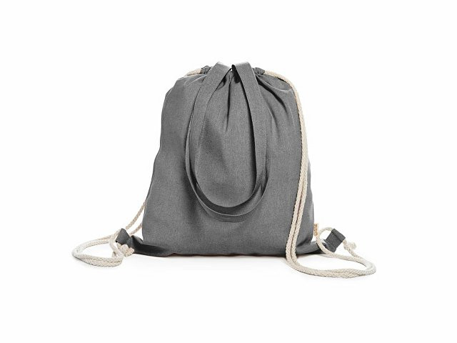 Рюкзак-мешок из переработанного хлопка плотностью 140 г/м² с меланжевой отделкой, ручками длиной 70 см в тон и шнурками натурального цвета.